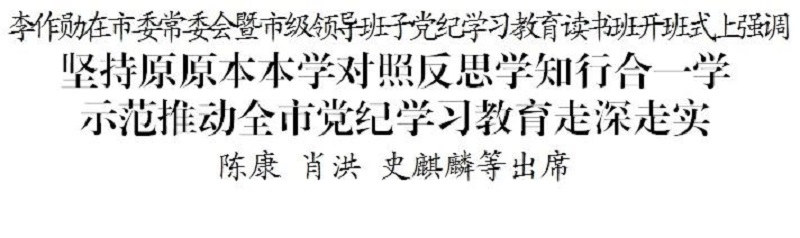 4月21日,市委常委会暨市级领导班子党纪学习教育读书班开班。市委书记、市委党的建设工作领导小组组长李作勋主持开班式并讲话。市人大常委会主任陈康,市政协主席肖洪,市委副书记史麒麟,市委常委,市人大常委会、市政府、市政协领导班子成员和党组成员出席。